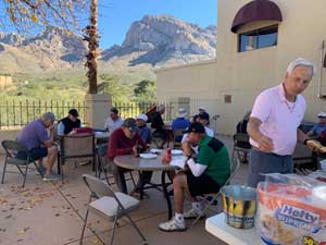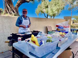 ‘Executive Chef’ Tony D’Angelo coordinates the event and cooks for everyone. Tony hauls in his portable BBQ grill, paper goods, food, serving table, and prepares a meal extraordinaire for the players. Each player donates what they can for the food and one player donates and brings the beverages for everyone. The men congregate and eat on the patio located by Pusch Ridge’s tennis office.